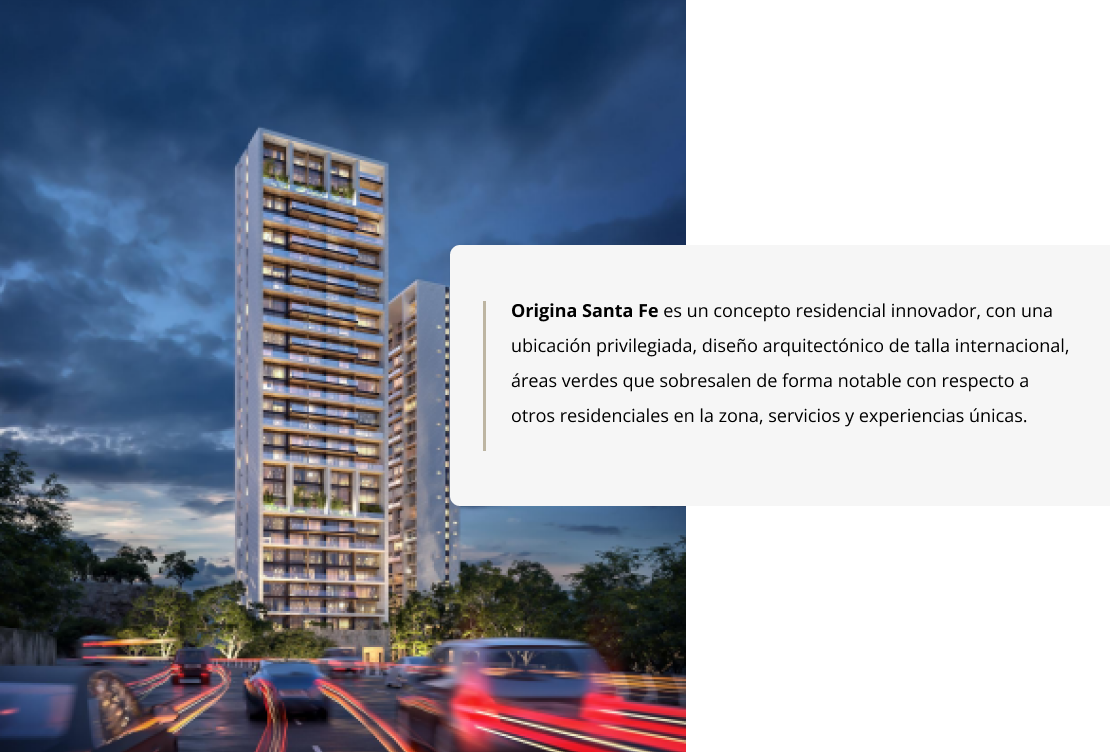 Origina Santa Fe es un concepto residencial innovador, con una ubicación privilegiada, diseño arquitectónico de talla internacional, áreas verdes que sobresalen de forma notable con respecto a otros residenciales en la zona, servicios y experiencias únicas.